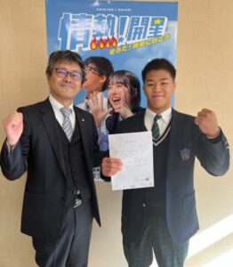 2024-11-29小山内校長日記 校長日記491「合格内定報告No,26」この度、倉橋英太君が合格内定報告に来ました。将来は建築士を目指し、住宅産業を盛り上げて様々な建築設計に携わるため、建築学科のある大分県の大学に進学を決めました。建築分野で人の役に立つ仕事ができるように、大いに学びを続けてください。 残りのオープンスター開星での生活で、しっかりと学ぶ準備をしてください。本当におめでとうございます。 KAISEIブログ一覧 KAISEIブログ一覧