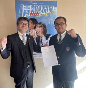 2024-11-29小山内校長日記 校長日記492「就職採用内定報告No,11」この度、俵匡史君が就職採用内定報告のため校長室に来ました。本当にありがとうございます。県民の安全と安心を守れる仕事に魅力を感じ、警察官に憧れて島根県警察採用試験を見事に突破しました。希望の警備部門で大いに活躍することを期待してます。残りのオープンスター開星の生活をしっかりと過ごしてください。人生は続く! KAISEIブログ一覧 KAISEIブログ一覧